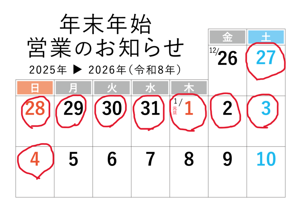 2025年12月27日から2026年1月4日まで、誠に勝手ながら休業とさせていただきます。